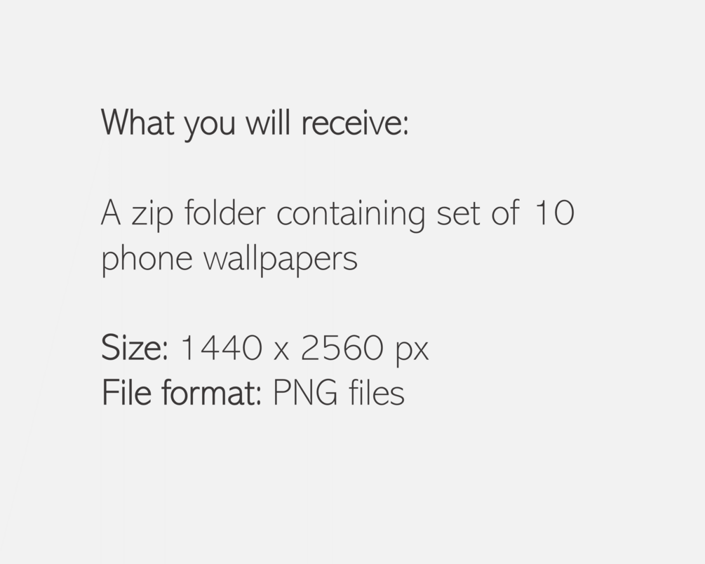 Upon purchase you will receive PNG files of size (1440 x 2560) and the same in PDF format.