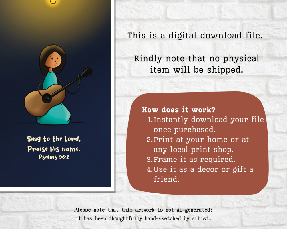 Digital print: Sing praise to the Lord. Scripture Art. Wall decoration. Christian gift. Bible Verse. Musician. Girl with Guitar. Psalm art.